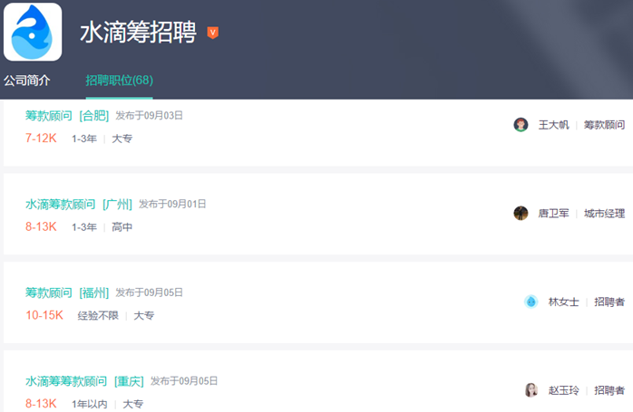 水滴筹则在合肥、广州、福州、重庆、长沙、镇江、银川、深圳、昆明、南京、无锡、萍乡、泸州、曲靖、南充、新余、宜春、成都等地招聘“筹款顾问”职位。