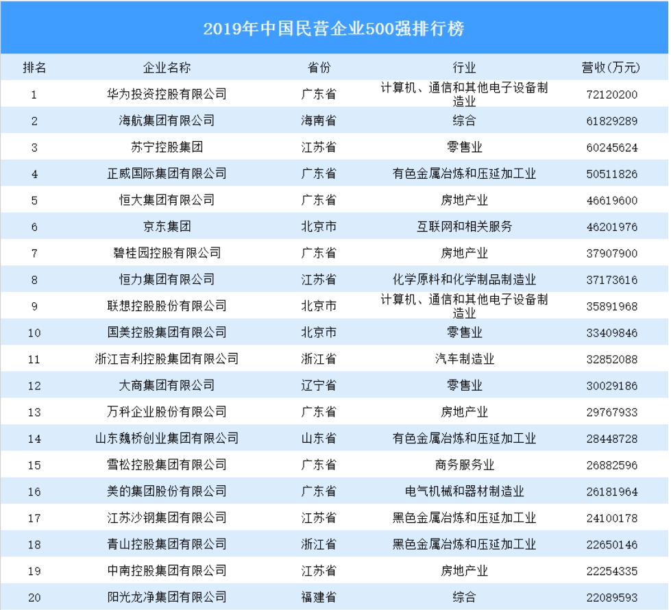 2019年中国民营企业500强前20名单(图片来源:中商产业研究院)