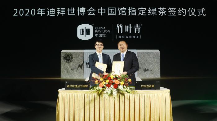 中国贸促会贸易投资促进部世博会事务处副处长方可(左)与四川省峨眉山竹叶青茶业有限公司董事长唐先洪(右)进行2020年迪拜世博会中国馆指定绿茶签约仪式
