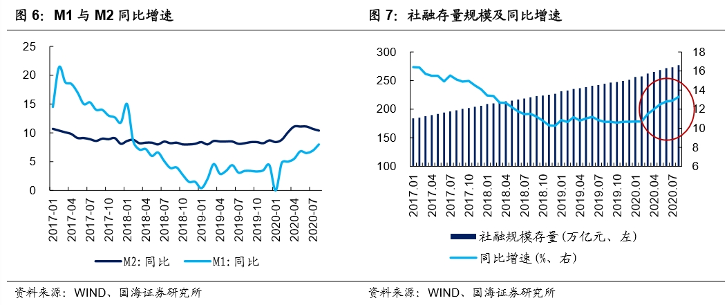其中M2增速回落,一方面与近期房地产销售回暖下,居民储蓄存款(M2)转向企业部门存款(M1)有关;另一方面也与财政存款明显增加所带来的抽取效应有关,这也是造成本月社融增速变动与M2增速变动出现背离的原因。