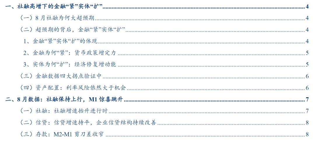 实体为何“扩”:经济修复增动能。实体经济流动性的持续向好,我们认为其中企业活力的主观修复为主因,监管政策的客观引导为次因。社融分项数据中,8月转贴利率的抬升和票据融资的收缩,说明信贷的高增并非月末银行以票充贷所致。居民长贷多增1000亿对应房地产和汽车销售的持续向好以及房地产固投的潜力,企业长贷的持续多增及政府债券融资的放量说明基建向上动力持续。未贴现承兑汇票持续多增侧面映证了出口的屡超预期。其次M1进一步上行至8%。反映8月开始企业部门从居民、政府、金融三部门的所得资金流开始共振向好:商品房销售额累计增速向上修复接近0%,广义财政支出增速下半年有望抬升至13%,表外融资由于实体活力的修复(出口、地产)尤具韧性,且小微融资依然是货币政策“保主体、稳就业”的重中之重。