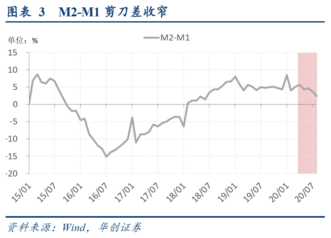 8月M1同比快速跳升至8%,而M2同比继续下跌至10.4%。在房地产销售快速抬升(从30大中城市销售数据、居民长期贷款基本可以得到验证)、表外票据和小微贷款继续增长、财政支出效率提升的情况下,M1的增速抬升在我们的预期之内。对比之下,M2同比回落的背后,一则体现了8月以来货币政策的极度克制,二则反映财政融资对于广义流动性的分流。M2-M1的剪刀差自今年5月以来进入下行通道,背后是货币政策从“宽货币”到“宽信用”下,流动性金融紧实体扩的直接体现,在存款活化比例不断提高的同时,实体经济增长仍具修复动能,但金融市场配置资金却将持续承压。