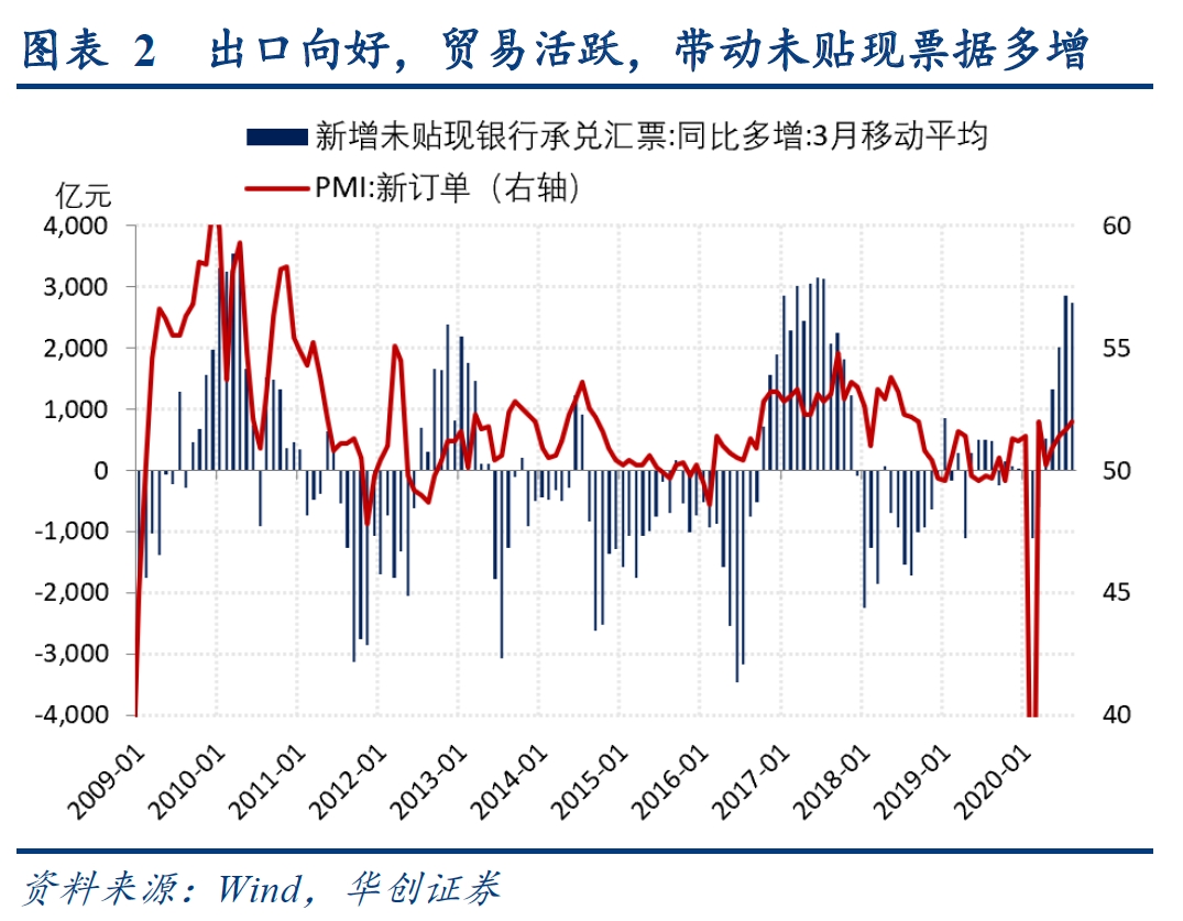 其次,表外融资同比多增1725亿元,尤其是未贴现银行承兑汇票新增1441亿(前值:减少1130亿)大超市场预期,我们认为这与近期出口数据的屡超预期是同步的。出口向好,贸易活跃,贸易企业开票融资积极。
