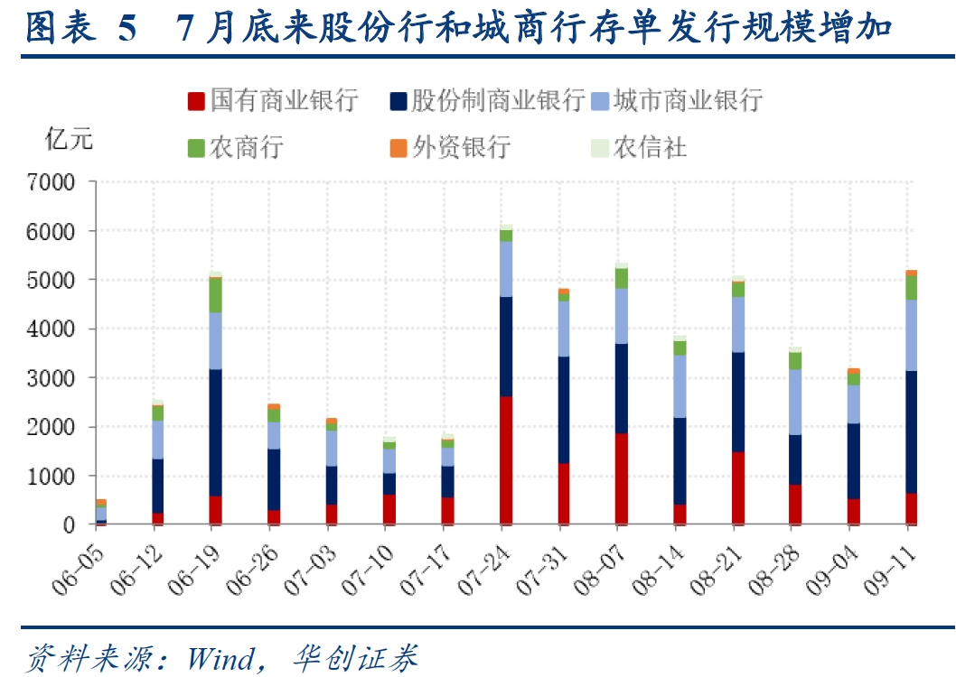 “紧平衡”的背后,不仅是8月政府债券融资放量吸收了巨额的流动性,更重要的是货币政策正常化下定力的提升。一则在监管上,结构性存款持续压降的要求给银行负债端带来了巨大压力,5-7月结构性存款已经压降近2万亿。负债压力下,同业存单发行规模提升,尤其集中在股份行和城商行。二则在公开市场操作上,央行面对资金面的紧张极其克制,配合财政融资和支出节奏,保持DR007在2.2%附近震荡。