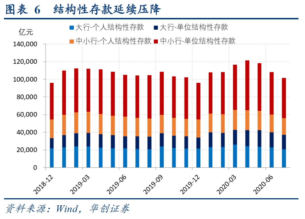 8月超预期的社融和“紧平衡”的资金面形成鲜明对比,这背后实际反映了当下金融“紧”实体“扩”的流动性状态。8月金融数据即可为这种矛盾印证一二——首先,M2-M1剪刀差自5月以来持续收窄,8月已经压降至2.4个百分点。M1作为企业的活期存款,反映的是企业基于生产的资金周转所需,M2则是对广义流动性衡量,M2-M1剪刀差收缩的背后是货币政策从“宽货币”到“宽信用”下,存款活化比例不断提高。其次,本月四部门存款中实体部门(政府、企业、居民)存款多增8200亿,而非银金融存款同比多减9910亿元,也反映了这一流动性的差异。