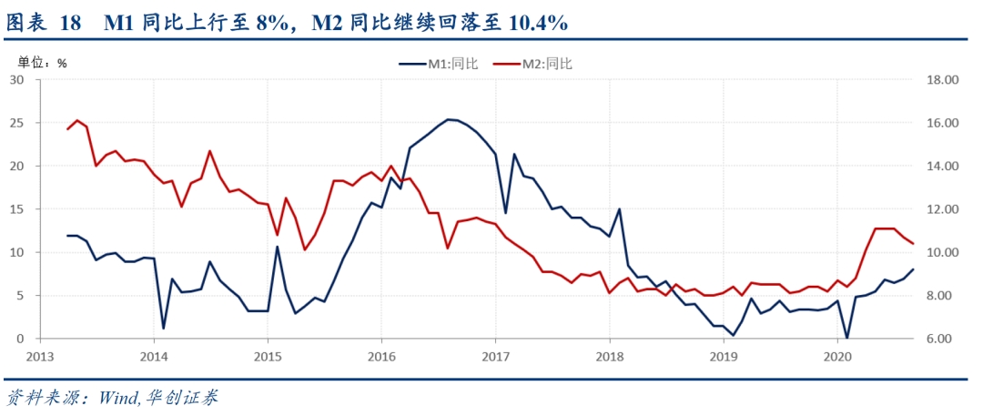 就此,8月金融数据更进一步映证了我们在上月点评中“金融数据四大拐点”的判断:M2拐点(5月)→ 信贷增速拐点(7月)→社融增速拐点(预计10月)→M1拐点(预计2021Q1),分别对应了货币政策不同阶段的目标。我们预计四季度前政府债券融资依然会是支撑社融上行的主要动力,未来社融增速将持续上行至10月达到年内高点(13.6%左右)。而M1受益于三因素的共振修复,叠加明年一季度的低基数效应,或将持续回升至2021年Q1达到高点,或达9%-11%。