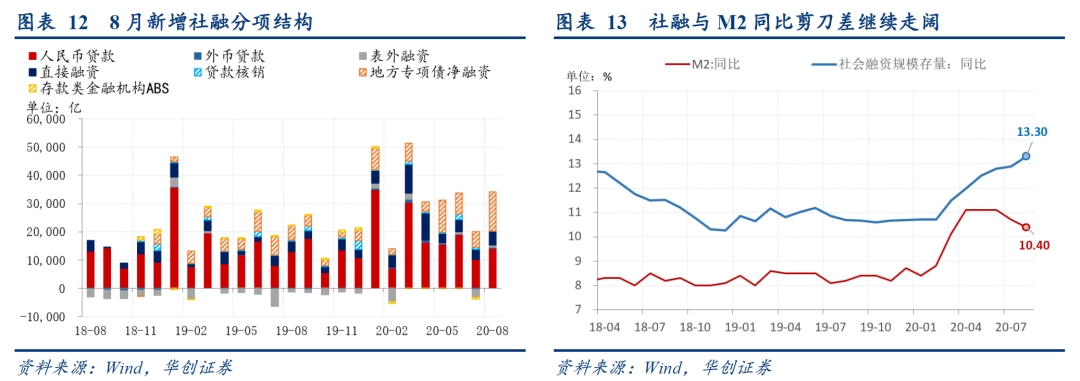 2020年8月新增社融3.58万亿(前值1.69万亿),新增人民币贷款1.28万亿元(前值9927亿),社融存量同比增长13.3%(前值12.9%),M2同比增长10.4%(前值10.7%),M1同比增长8%(前值6.9%)。
