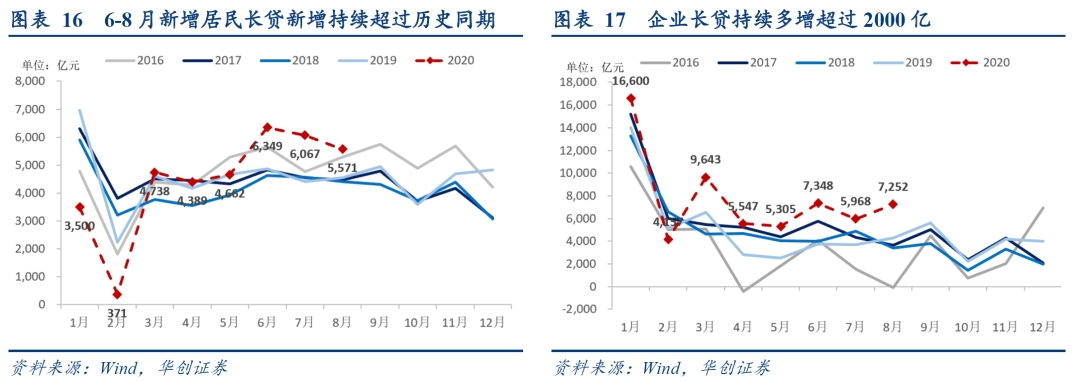 8月新增人民币贷款1.28万亿,同比多增700亿,环比多增2873亿,人民币贷款余额增速持平于13%。在信贷增速保持平稳的同时,企业信贷结构持续改善,企业部门票据融资收缩1676亿依然表现弱势,一则严监管限制,二则银行主动冲量增贷的动力不强,而企业长贷在基建、地产、出口三者共振上行的带动下多增依然超过2000亿。居民部门,房地产与汽车销售强劲带动居民长贷保持多增。