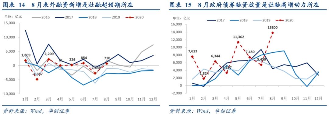 8月新增社融3.58万亿,同比多增1.39万亿,存量同比上升0.4个百分点至13.3%,远超市场预期。8月社融增速快速上行,背后最大动力依然是政府加杠杆力度的持续,社融口径下8月政府债权融资1.38万亿创年度新高。而8月社融增速大超市场预期,则要归功于信贷和表外融资的多增,尤其未贴现票据再次多增可谓惊喜。