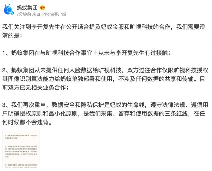 9月12日,蚂蚁集团在官方微博称,蚂蚁集团在与旷视科技合作事宜上从未与李开复先生有过接触;蚂蚁集团从未提供任何人脸数据给旷视科技,双方过往合作仅限旷视科技授权其图像识别算法能力给蚂蚁单独部署和使用,不涉及任何数据的共享和传输。目前双方已无相关业务合作。