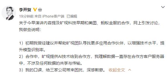 随后,李开复在微博发文就关于今早演讲内容提及旷视科技早期和美图、蚂蚁金服的合作,做出说明:1)初期我曾经建议并帮助旷视团队寻找更多应用合作伙伴,以增强技术水平,提升模型识别率。2)合作中,旷视提供AI技术给到合作方,我理解数据一直存在客户服务器中,不涉及任何数据的共享与传输。3)我的口误,给三家公司带来困扰,深感歉意。