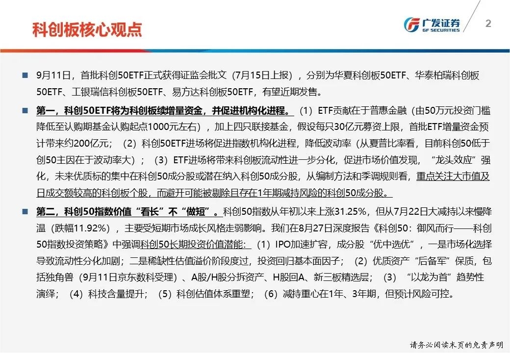 第二,科创50指数价值“看长”不“做短”。科创50指数从年初以来上涨31.25%,但从7月22日大减持以来慢降温(跌幅11.92%),主要受短期市场成长风格走弱影响。我们在8月27日深度报告《科创50:御风而行——科创50指数投资策略》中强调科创50长期投资价值潜能:(1)IPO加速扩容,成分股“优中选优”,一是市场化选择导致流动性分化加剧;二是稀缺性估值溢价阶段度过,投资回归基本面因子;(2)优质资产“后备军”保质,包括独角兽(9月11日京东数科受理)、A股/H股分拆资产、H股回A、新三板精选层;(3)“以龙为首”趋势性演绎;(4)科技含量提升;(5)科创估值体系重塑;(6)减持重心在1年、3年期,但预计风险可控。