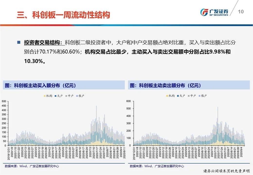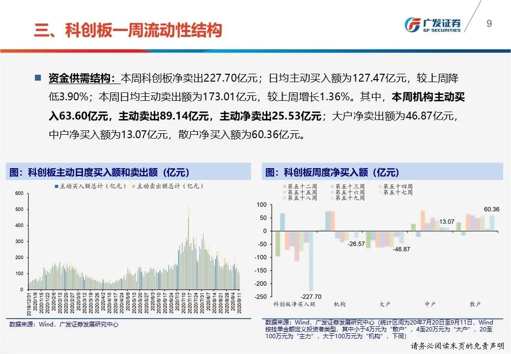 一周流动性结构:①本周科创板净卖出227.70亿元,机构主动净卖出25.53亿元;②机构本周主动买入与卖出交易额中分别占比9.98%和10.30%;③本周四融券余额为76.94亿元,相较上周五降低7.74%,融券/融资余额比为0.27。