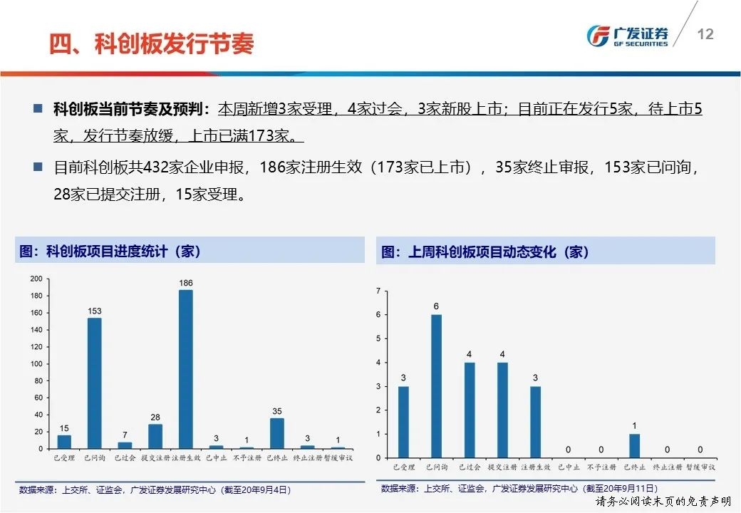 发行节奏:本周新增3家受理,4家过会,4家提交注册,3家新股上市;目前待上市5家,上市已满173家。