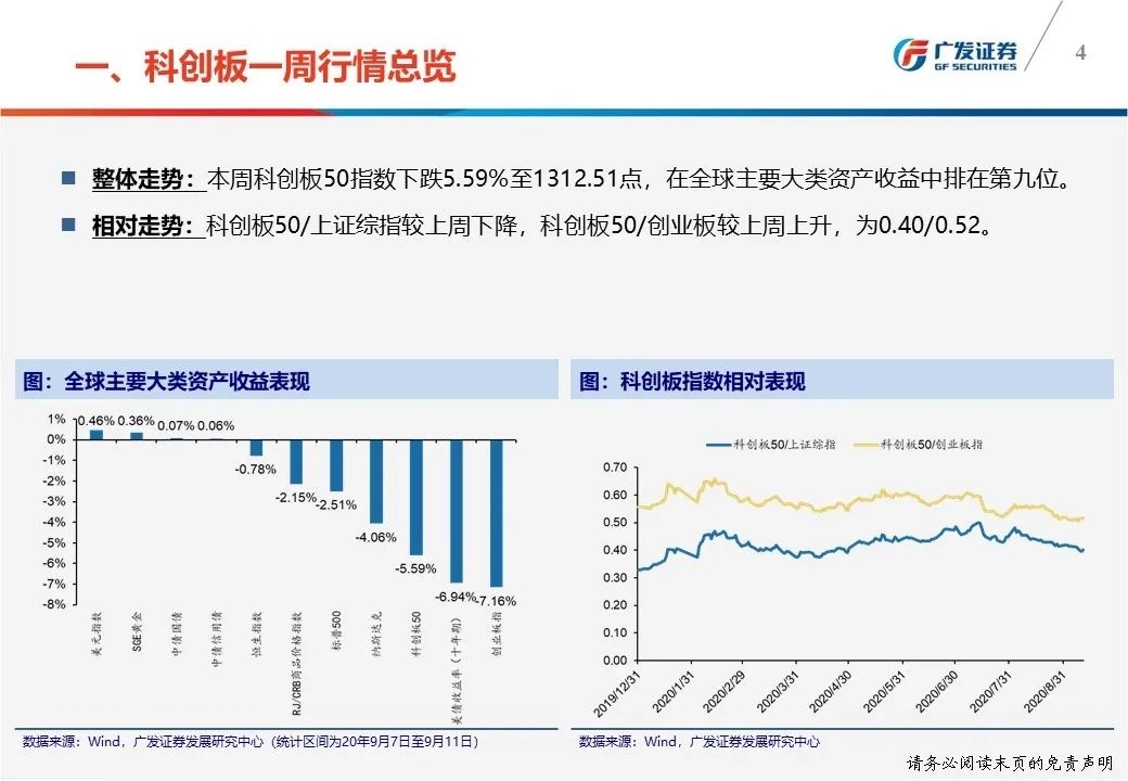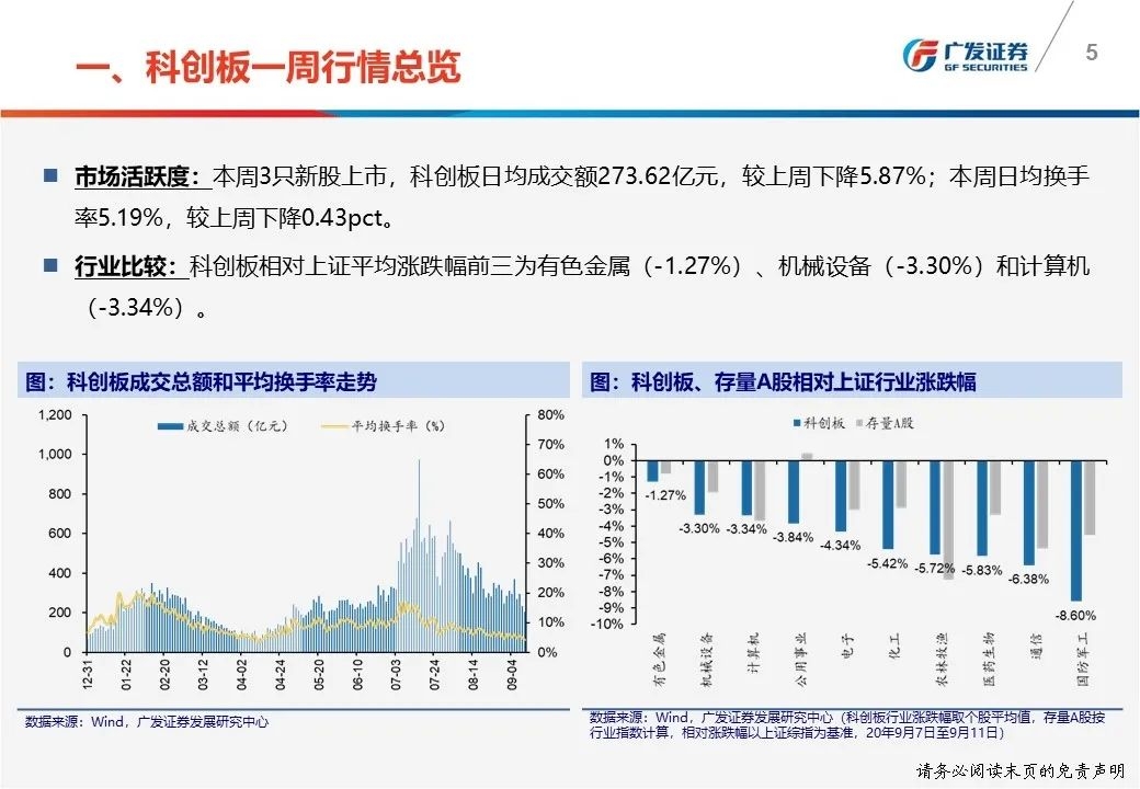 一周行情总览:①科创板50指数本周下跌5.59%至1312.51点;②本周日均成交额273.62亿元,较上周下降5.87%;本周日均换手率5.19%,较上周下降0.43pct。