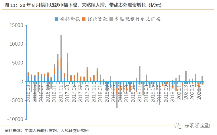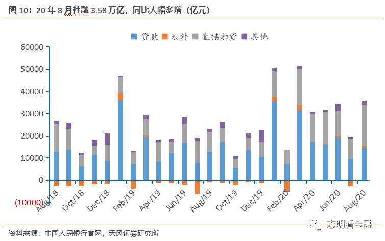 8月社融3.58万亿(7月1.69万亿,19年同期2.20万亿),同比大幅多增,多增主要来自政府债券、未贴现银承和信贷。8月地方债发行放量,政府债券净融资达1.38万亿,同比大幅多增,对社融贡献大。8月企业债发行有所恢复,净融资3633亿,股票融资1282亿。8月直接融资合计达1.87万亿。表外融资小幅增长,8月未贴现银行+1441亿,带动表外融资+710亿。