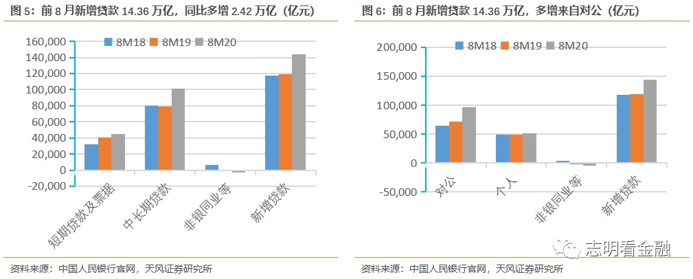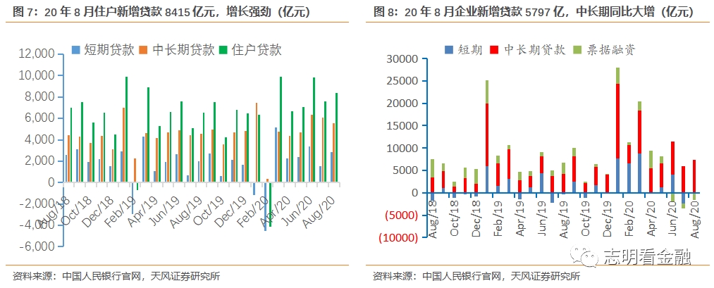 8月企业信贷+5797亿(19年同期6513亿),增量同比少增但信贷结构好。国内经济好转,企业融资需求改善,企业中长期贷款+7252亿,而收益率偏低的短贷及票据融资合计-1629亿。