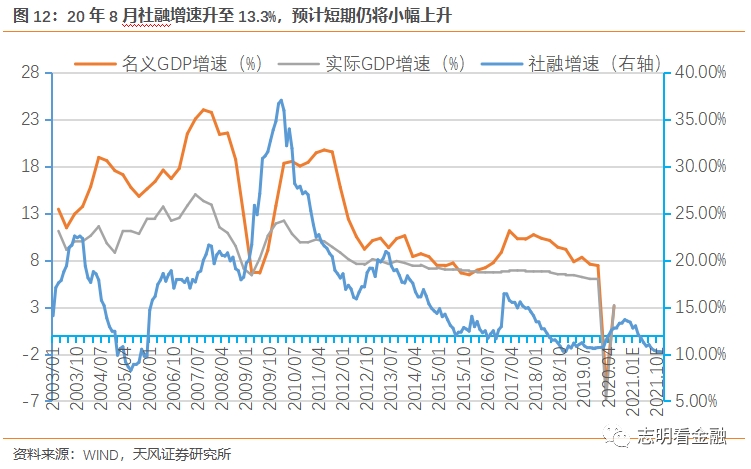 社融增速小幅上升。由于政府债券发行放量支撑社融同比大幅多增,8月末社融增速小幅上升至13.3%。尽管货币政策边际收紧,但剩余待发行政府债券仍较多,我们预计仍将小幅上升。我们预计全年社融达34.6万亿,社融增速达13.3%。随着稳杠杆成为政策重心,2021年社融增速或降至10%出头。
