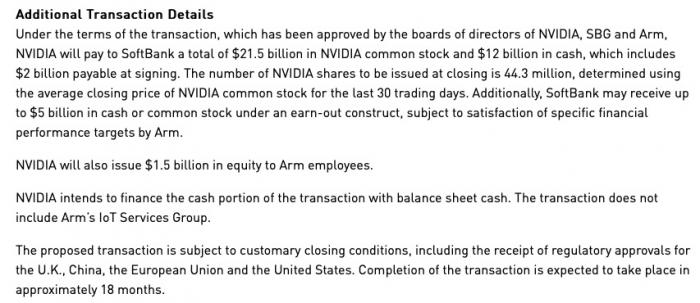 由于Arm目前的最大股东是日本投资机构软银,英伟达目前已与软银达成了协议,将以400亿美元的交易价格,从软银处收购Arm公司。