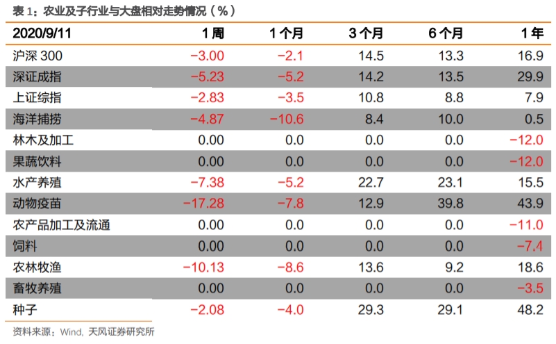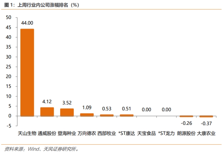 本周(2020年9月7日-2020年9月11日),农林牧渔行业-10.13%,同期沪深300、上证综指、深证成指变动分别为-3.00%、-2.83%、-5.23%。个股中,涨幅靠前的为:天山生物+44.00%、通威股份+4.12%、登海种业+3.52%、万向德农+1.09%、西部牧业+0.53%、*ST康达+0.51%。