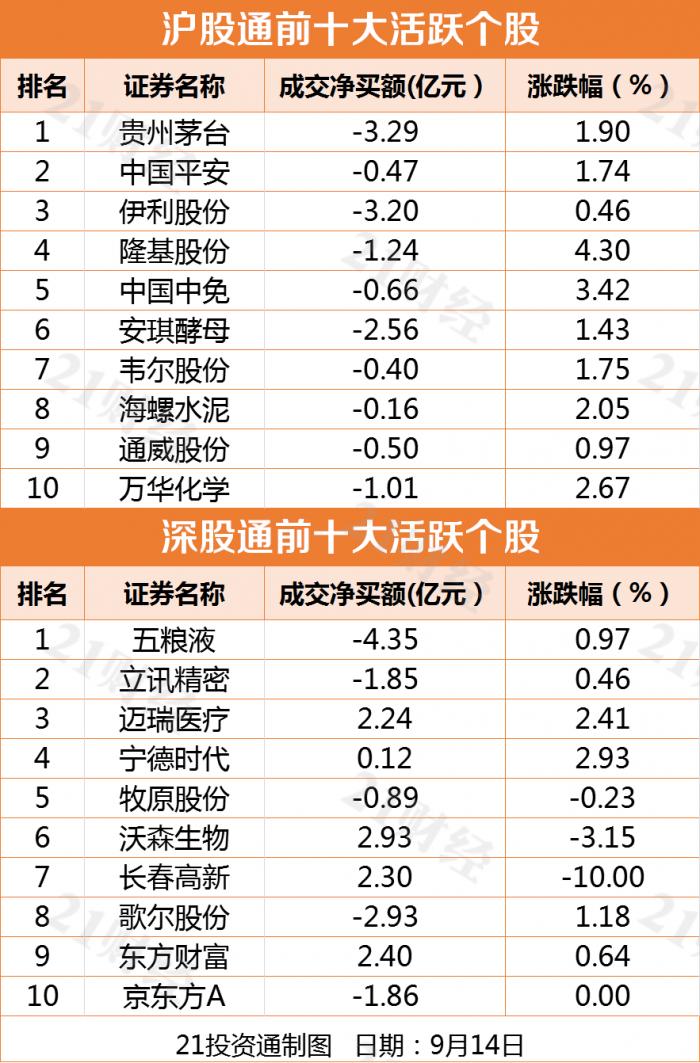 净卖出方面,五粮液(000858.SZ)、 贵州茅台(600519.SH)、伊利股份(600887.SH)、歌尔股份(002241.SZ)居前,分别被净卖出4.35亿、3.29亿、3.20亿、2.93亿。