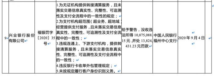 央行福州中心支行如此描述兴业银行违法行为类型:1.为无证机构提供转接清算服务,且未落实交易信息真实性、完整性、可追溯性及支付全流程中的一致性的规定;2.为支付机构超范围(超业务、超地域)经营提供支付服务,且未落实交易信息真实性、完整性、可追溯性及支付全流程中的一致性;3.违规连通上、下游支付机构,提供转接清算服务,且未落实交易信息真实性、完整性、可追溯性及支付全流程中的一致性;4.违反银行卡收单外包管理规定;5.未按规定履行客户身份识别义务。