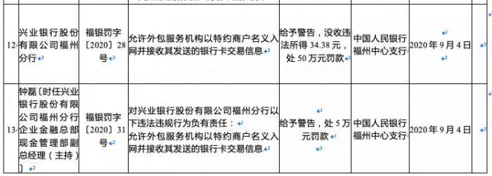 与此同时,由于兴业银行福州分行“允许外包服务机构以特约商户名义入网并接收其发送的银行卡交易信息”,央行福州中心支行决定,给予警告,没收违法所得34.38元,处50万元罚款。