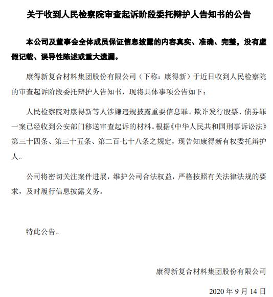 9月14日,*ST康得公告称,公司于近日收到人民检察院的审查起诉阶段委托辩护人告知书,人民检察院对康得新等人涉嫌违规披露重要信息罪、欺诈发行股票、债券罪一案已经收到公安部门移送审查起诉的材料。根据《中华人民共和国刑事诉讼法》第三十四条、第三十五条、第二百七十八条之规定,现告知康得新有权委托辩护人。