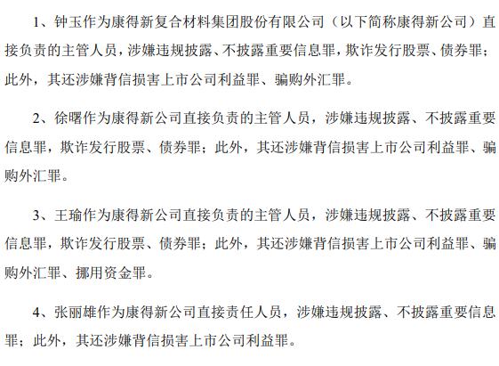 3、王瑜作为康得新公司直接负责的主管人员,涉嫌违规披露、不披露重要 信息罪,欺诈发行股票、债券罪;此外,其还涉嫌背信损害上市公司利益罪、骗购外汇罪、挪用资金罪。