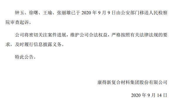 康得新复合材料集团股份有限公司涉嫌欺诈发行股票、债券案一案,已于2020 年9 月9日被移送人民检察院审查起诉,该涉嫌犯罪事实均发生在 2012 年以后。