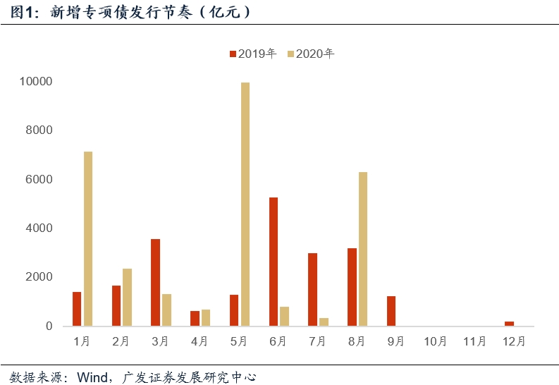 根据财政部数据,截至8月底地方新增专项债共计发行28969亿元,完成81.6%。其中,7月发行规模较小,共计349亿元,为同月抗疫特别国债大量发行所致;8月发行规模恢复常态,共计6307亿元,两月合计6656亿元,占全年比重17.7%。