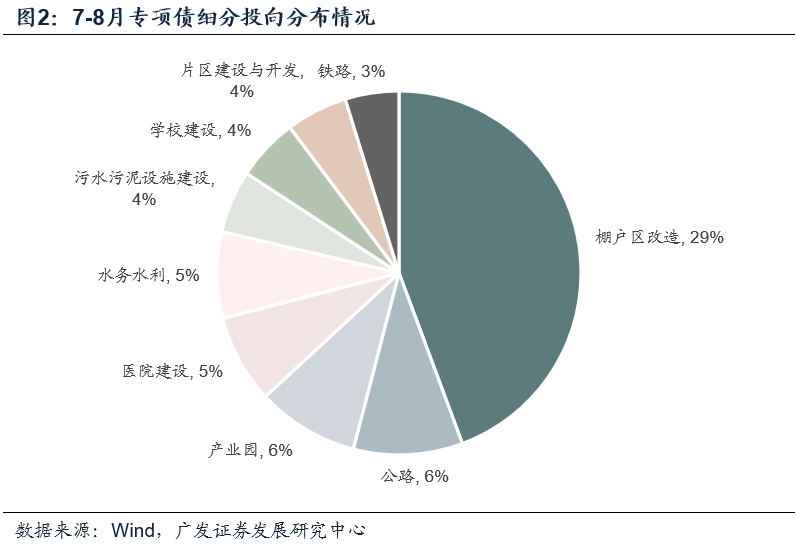 就投向的结构分布而言,据中债登统计数据,7-8月专项债主要分布于棚户区改造(占比29%,下同)、交通运输(13%)、生态环保(9%)、市政建设(7%)、传统产业园区(6%)、医疗卫生(6%)、新基建(5%)等。其中,基建类项目投资占比合计约为41%,较上半年的66%下滑了25个百分点,主因为棚改债的挤占。