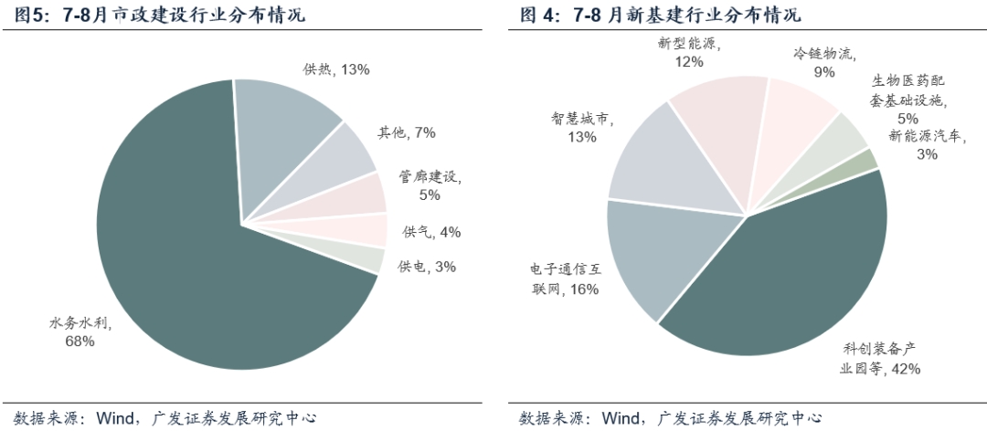 从另一维度来看,即与2019年全年比较,7-8月投向占比边际上升较为显著的领域有:新基建(提升5.7pct,下同)、非科技产业园(5.1pct)、市政建设(3.2pct)、医疗卫生(3.0pct)、水务水利(2.7pct)、旧改(2.5pct)、污水污泥设施建设(2.3pct)、医院建设(2.2pct)等。整体来看,从占比这一维度观察,除棚改外,7-8月的边际变化依然延续了5-6月的大体趋势。