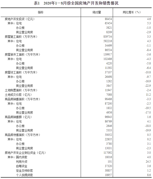9月15日,国家统计局发布《2020年1—8月份全国房地产开发投资和销售情况》。