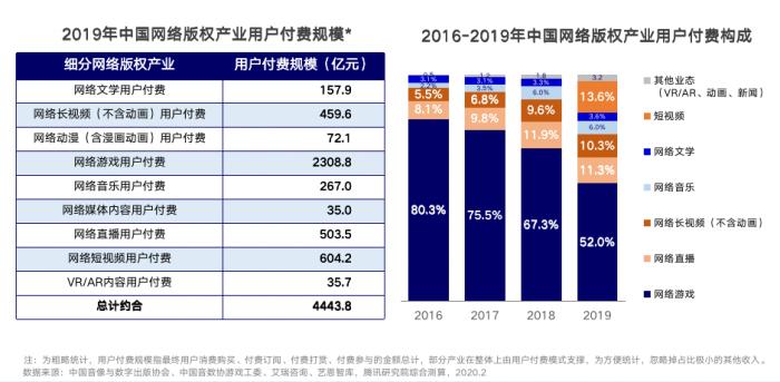 在用户付费层面,中国网络版权产业2019年的付费规模约4444亿元,同比增长20.6%。
