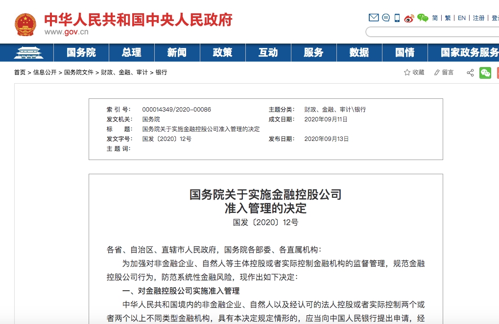 今日,国务院官方网站发布《国务院关于实施金融控股公司准入管理的决定》(以下简称《决定》)。