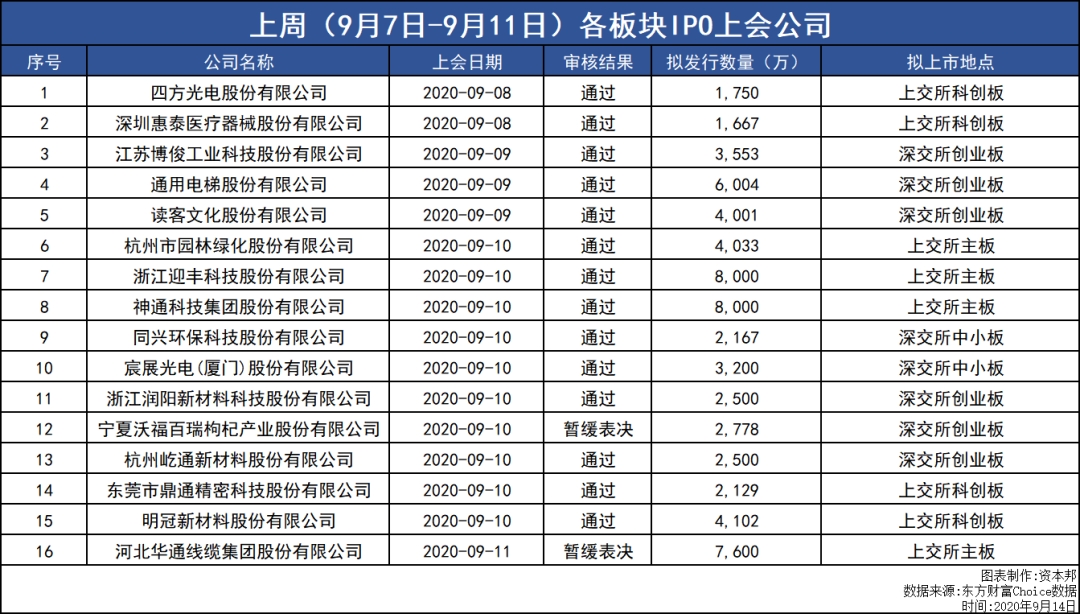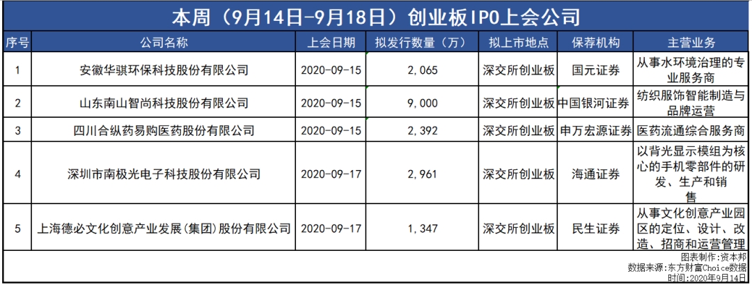 此外,创业板上市委2020年第26次审议会议公告定于2020年9月17日召开,审议的公司有:深圳市南极光电子科技股份有限公司、上海德必文化创意产业发展(集团)股份有限公司。