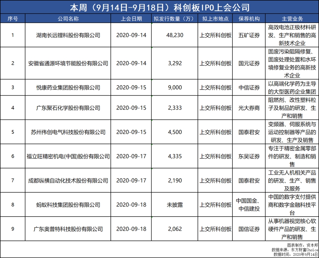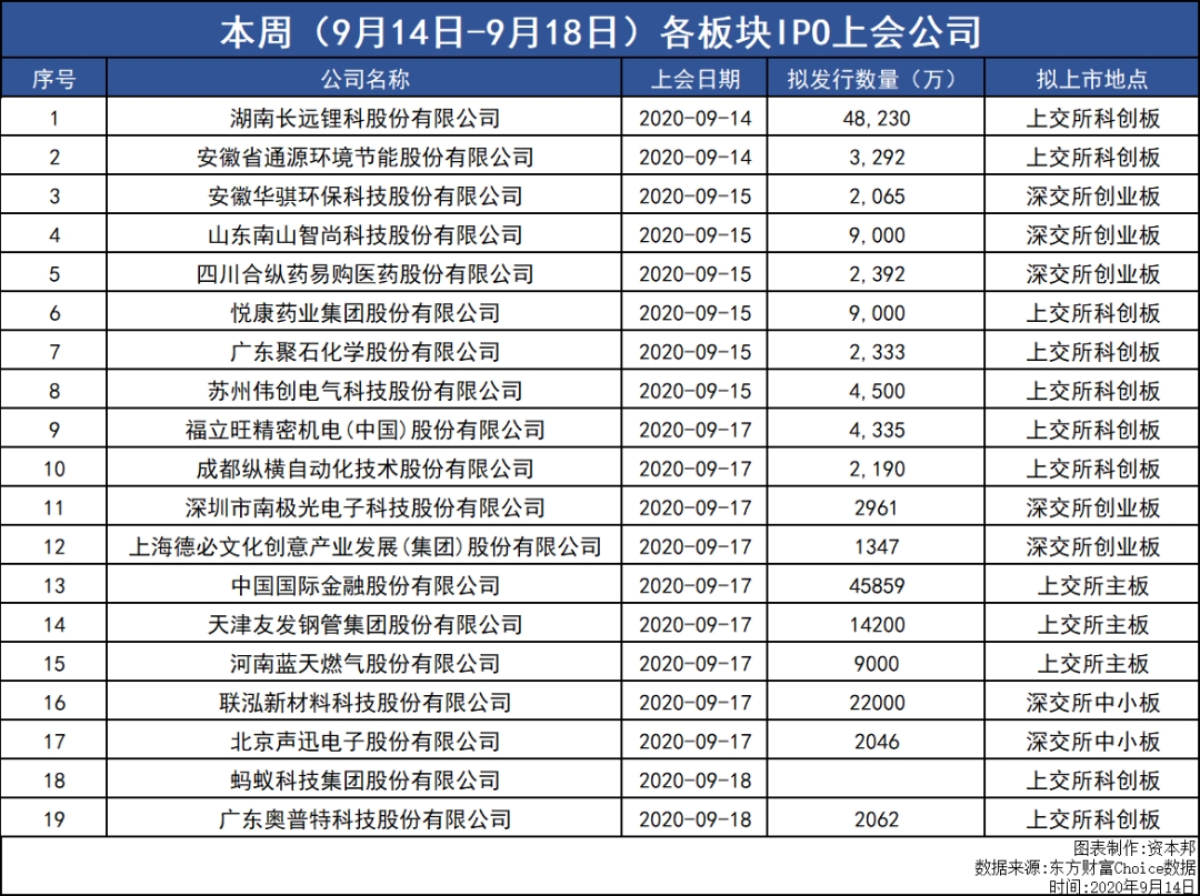 本周(9月14日-9月18日),共计有19家公司上会接受IPO审核。其中集中了大部分视线的蚂蚁集团将拟登陆科创板,上会时间为2020年9月18日,其港股招股文件显示,蚂蚁集团拟在A股和H股发行的新股数量合计不低于发行后总股本的10%,发行后总股本不低于300.3897亿股(绿鞋前),意味着将发行不低于30亿股新股。
