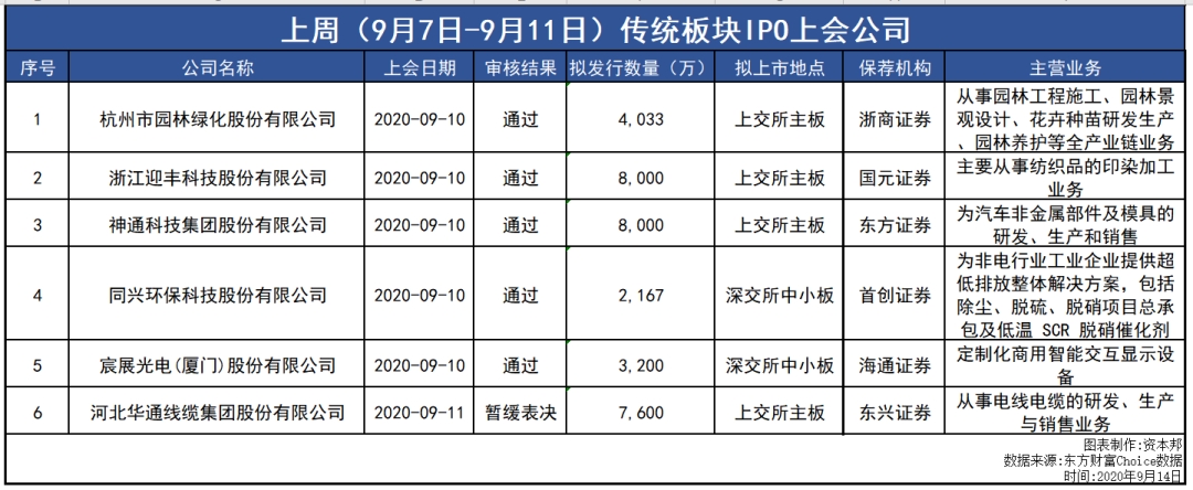 结合下图可以看出,上周(9月7日-9月11日)市场上一共有6家拟在传统板块上市的企业进行上会。其中,拟在上交所主板上市的有4家企业,拟在深交所中小板上市的有2家企业。