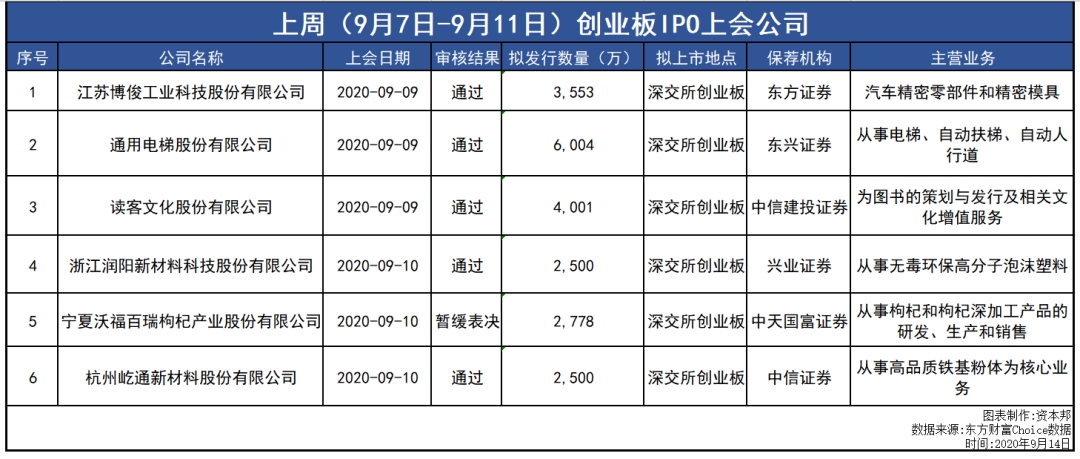 2020年9月9日,深交所创业板上市委员会2020年第23次审议会议召开,首发上会企业最终结果三过三,江苏博俊工业科技股份有限公司(下称:博俊科技)、通用电梯股份有限公司(下称:通用电梯)、读客文化股份有限公司(下称:读客文化)顺利过会。