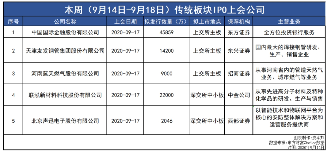 据悉,中国证券监督管理委员会第十八届发行审核委员会定于2020年9月17日召开2020年第138次发行审核委员会工作会议,届时将审议:中国国际金融股份有限公司、天津友发钢管集团股份有限公司、联泓新材料科技股份有限公司、北京声迅电子股份有限公司、河南蓝天燃气股份有限公司的IPO首发。