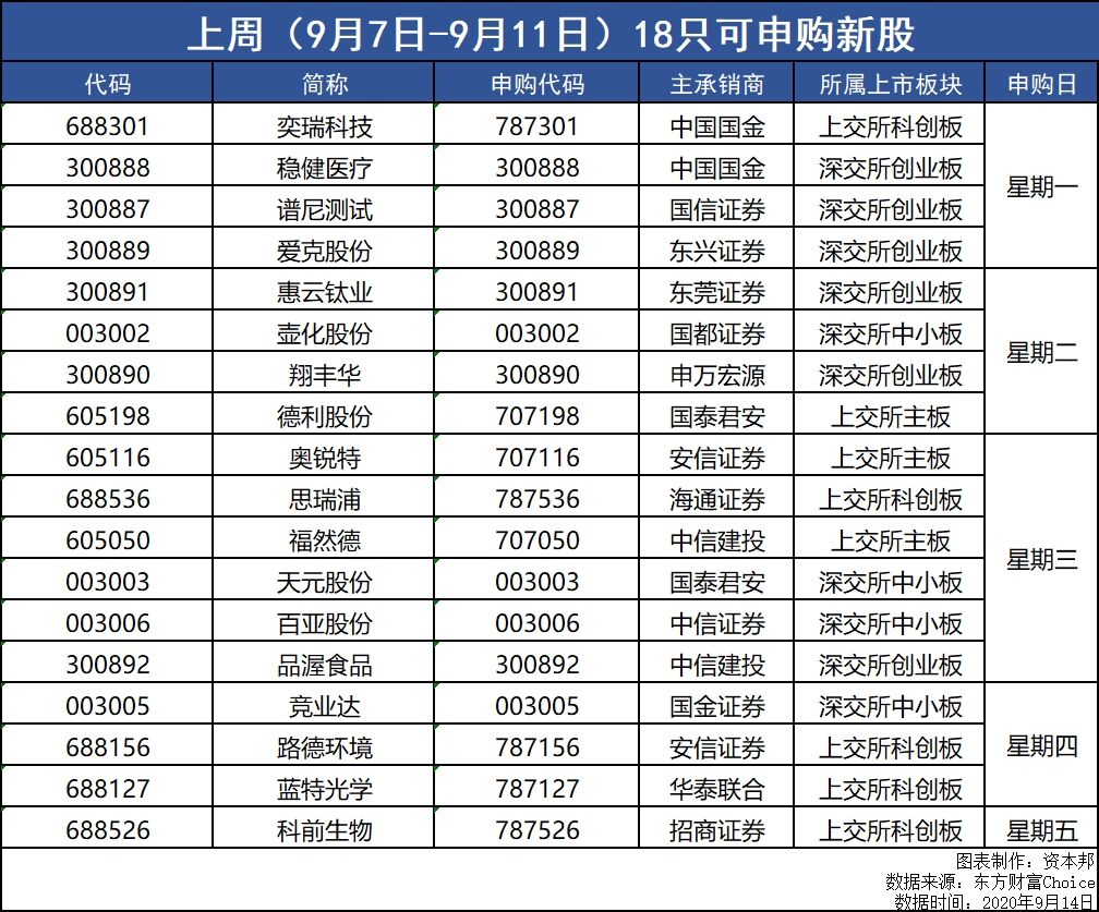 据东方财富Choice数据,上周(9月7日-9月11日)有18只新股可申购。其中,上交所科创板新股5只、上交所主板3只、深交所创业板新股6只、深交所中小板4只。