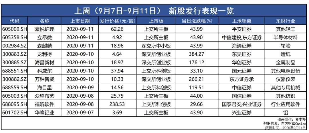 上周(9月7日-9月11日)共有11只新股上市,其中科创板新股3只、上交所主板新股4只、深交所创业板新股3只、深交所中小板1只。