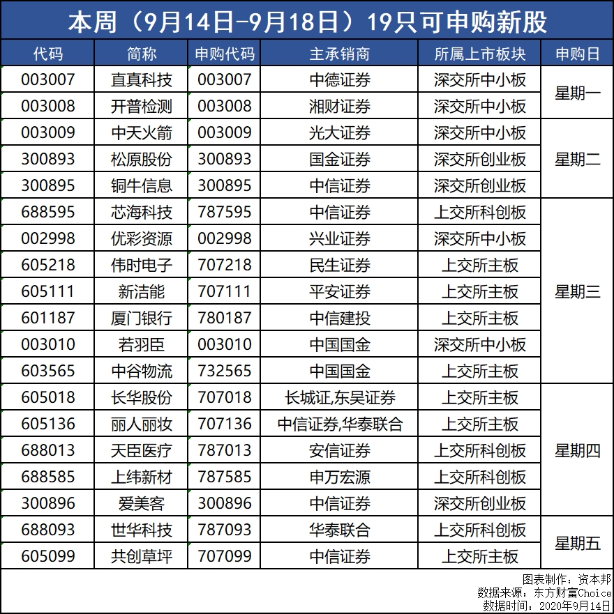 本周(9月14日-9月18日)将有19只新股可申购。其中,上交所科创板新股4只、上交所主板7只、深交所创业板新股3只、深交所中小板5只。