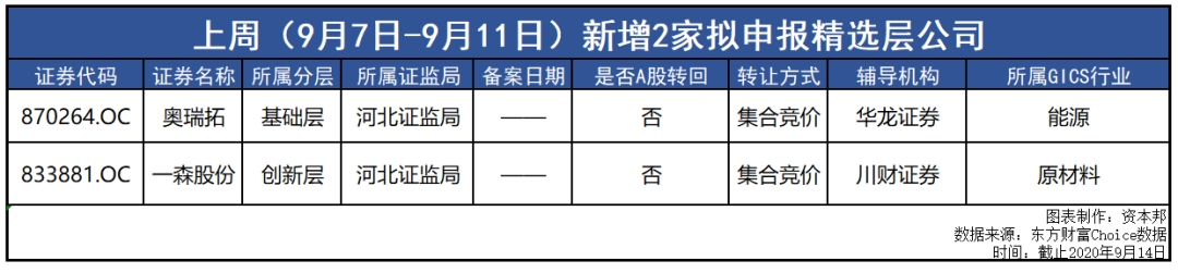 上周(9月7日-9月11日),市场中只有奥瑞拓(870264.OC)、一森股份(833881.OC)2家企业透露出申报精选层的意愿,该2家企业均进入了辅导期阶段。