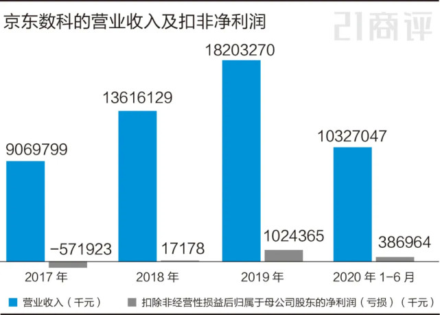 从业绩来看,2017年到2020年上半年,京东数科分别实现营业收入90.7亿元、136.16亿元、182.03亿元和103.27亿元,保持增长;扣非净利润分别为-5.72亿元、0.17亿元、10亿元、3.87亿元,经营利润前两年已转正。