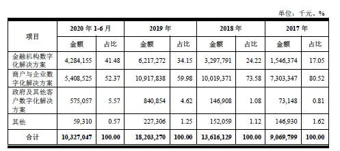 但是,这一决定为京东数科带来了实打实的收入,也规避了资本金等硬约束,为成长打开了一条新路。服务金融机构的业务,2017年到2020年上半年,收入分别为15.46亿元、32.98亿元、62.17亿元和42.84亿元,年复合增长率达到100.51%。