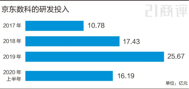 招股书显示,公司的研发费用逐年增加。2017年到2020年上半年的研发投入分别为10.78亿元、17.43亿元、25.67亿元和16.19亿元,占营业收入的比例逐年提高,分别为11.88%、12.80%、14.10%和 15.67%。对比来看,蚂蚁集团今年上半年的研发费用占营收比为7.89%,只有京东数科的一半。
