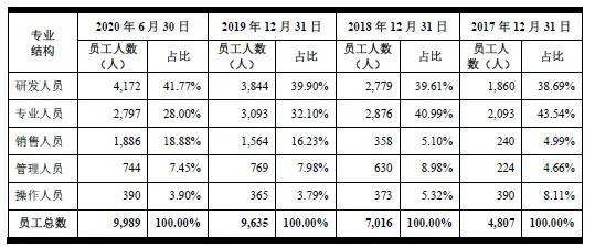 从员工结构来看,截至2020年6月30日,京东数科共有在岗员工数9989人,其中研发及专业人员占公司员工总数的比例约为70%。