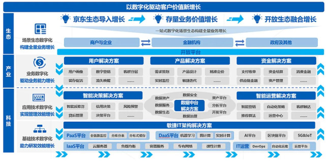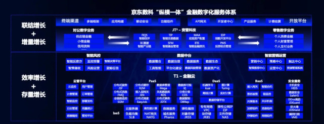 在金融科技领域,京东数科以T1金融云和JT²资管科技平台为基础,一方面,将自身积累多年的IT架构能力、数据中台搭建能力、智能风控能力能力输出给金融机构,向效率要增长、向存量业务要增长;另一方面,通过数字化能力输出,助力金融机构打造开放生态,向联结要增长,并将京东数科打造的金融服务场景、金融用户、金融业务,直接联结到金融机构的服务体系,搭建第二增长场景,向新客群、新业务要增长。